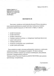 Wydział Planowania i Realizacji Inwestycji Urzędu Miasta Tarnowa zaświadcza, że firma ARCHI-TEKTONIKA Krzysztof Wrona, ul. Ogrodowa nr 3, 39-200 Dębica, NIP 8722320267, REGON 180649525 była Wykonawcą zadania inwestycyjnego polegającego na opracowaniu dokumentacji projektowej przebudowy Placu Tadeusza Kościuszki w Tarnowie na działce nr 167/5 obręb 0263 w ramach zadania pn. „Przebudowa placu Tadeusza Kościuszki - dokumentacja”.